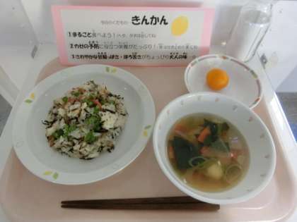 きんかんは、本当は甘露煮やジャムの方が一般的かつ食べやすいのですが、今はそもそもきんかんを知らない児童も多いと思い、こんな果物があるよ!ということを知ってほしくてそのまま出しました。また、きんかんは咳止めとして食べられることもあります。毎日の給食を残さず食べて、3学期も元気に過ごしてほしいと思います!