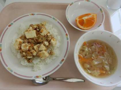 今日の果物は南津海(なつみ)です。カラマンダリンとポンカンの交配種で、見た目は大きめの温州みかんのようです。やわらかい皮は剥きやすく、じょうのう膜も薄いので、子どもたちも気にせず食べることができました。濃い甘さが、ピリ辛の麻婆豆腐の後のデザートにぴったりです!