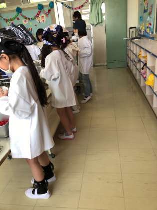 ピカピカの一年生! 今日は初めての給食でした。みんな大好きなカレーライス。早くもおかわりする子もいました。