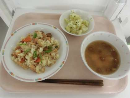 炊き込みごはんだと1年生はどのくらい食べられるのかな…と心配していましたが、クラスを覗いてみるとびっくり! おかわりの列ができていました。お家や保育園でよく食べていた子もいるようです。毎日の給食をパワーに変えて、1週間元気に過ごしてほしいと思います。