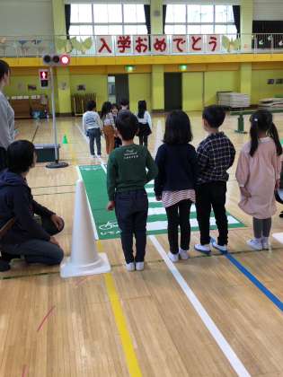生憎の雨ですが、1年生は一人での下校に備えて歩行訓練を行いました。青信号でも左右の確認、チカチカしたらもう渡らないなど基本を学びました。
