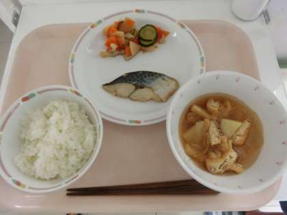 今日は春が旬の魚、鰆の照り焼きです。たれの半量で下味をつけ、焼きあがった後に残りのたれをかけています。味付けが濃くなりすぎないように、調理員さんがたれの量や漬け時間を考えて作ってくれました。