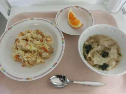 今日は千歳台小で人気の献立、キムチチャーハンです。キムチを豚肉や野菜と一緒に炒めて、ご飯に混ぜ込んで作りました。