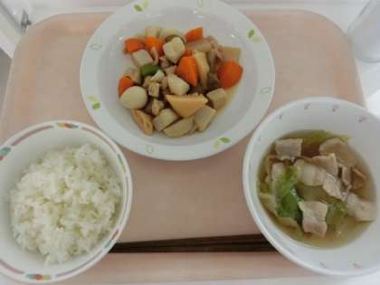 今日は野菜たっぷりの煮物です。さといも、にんじん、たけのこ、ごぼうなど、根菜がゴロゴロ入っているので、味の好き嫌いに咀嚼(そしゃく)の大変さも加わって、学年が上がっても苦手な子が多い傾向があります。