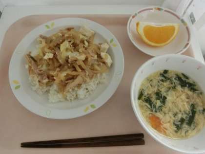 今日は豚丼です。豚肉やねぎ、こんにゃく、豆腐などを甘辛く煮たものをごはんに乗せていただきます。いつもはごはんを少し減らす子も、今日はおかわりをする勢いでおいしそうに食べていました。