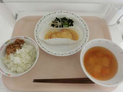 今日は白いごはんの上に「なめたけ」が乗ります。「えのきたけ」を調味料で煮て作った、給食室お手製のなめたけです。きのこがドーン!と鎮座する見た目のせいか、減らしてしまう子もいましたが、ごはんと一緒にたくさんおかわりしている子の方が多かったです。