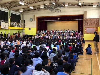 入学からはや3週目、全校デビューの日がやって来ました。上級生からの数々の歓迎の出し物に応えて、元気一杯に「さんぽ」を披露。大きな拍手をいただきました。