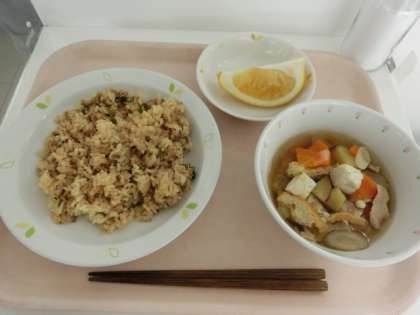 今日はさばのほぐし身と刻んだ、小松菜の混ぜご飯です。昨年度に同じメニューを作ったときは、味は美味しかったのですが小松菜がしょうゆ色になってしまい、全部が茶色くなってしまったのが心残りでした。そのため今回は、下茹でした小松菜のうち半量はしっかり味付けし、半量は仕上がり直前に入れることで緑色が残るようにしています(写真の色味だとわかりづらくなっていますが…)。