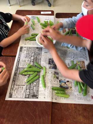 今日の給食の為に、1年生がグリンピースの皮むきをしました。全校のみんなが、一年生が一生懸命剥いた豆入りのご飯を美味しく食べてくれたら嬉しいですね。