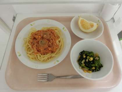 今日の献立はスパゲティです。このミートソースにはレンズ豆が入っています。あまり馴染みのない食べ物のためか、子どもだけでなく大人も一瞬「ん?」となったようです。小さいレンズ豆はそのままミートソースに混ぜてもほとんど違和感なく食べられます。豆類が苦手という子も完食してから「これって豆だったの?」と驚いていました。