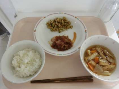 今日から、口の中の健康について見直すことを呼びかける「歯と口の健康週間」です。給食の時間の様子を見ていると、あまり噛まずに飲み込んでいる子が多いように感じます。給食では歯と口の健康週間に合わせて、噛み応えのあるメニューを取り入れました。今日は、煮た大豆にでんぷんをまぶして油で揚げ、青のりと塩を振った「揚げ大豆の磯和え」です。ポリポリとスナックのように大豆が食べられるので、煮豆の類は苦手な子も食べやすいのが特徴です。