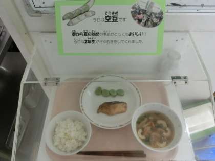 給食室にとどいたそらまめは、ごみや傷みがないか、調理員さんがもう一度よく確認してからゆでました。学年にもよりますが、一人に3個は行き渡りました。