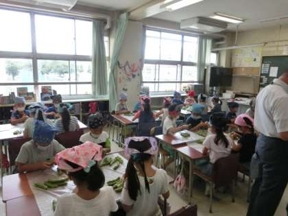 そらまめは今が旬の食べ物です。今日は、2年生にそらまめのさやむきをしてもらいました。「これが千歳台小のみんなの給食になるからね!」と伝えると、真剣にむき始めました。