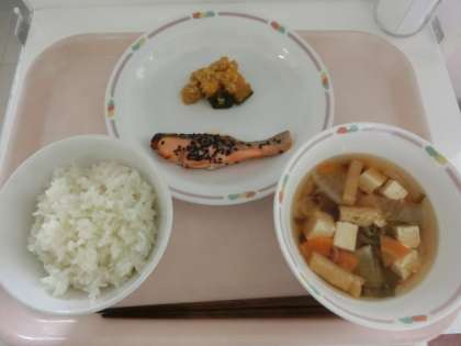 今日はしょうゆやみりんのタレに漬けた鮭に、ごまをまぶして焼きました。南部焼きの「南部」は今の青森県や岩手県、秋田県にまたがる広い地方で、ごまの名産地だったことからごまをまぶして焼いた料理を「南部焼き」と呼ぶようになったと言われています。「南部鉄器のところでしょ!」と気づけた子もいました。