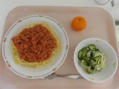 今日はぐっと気温が上がり、立っているだけで汗がにじむような暑さでした。給食は暖かいスパゲッティでしたが、人気のミートソースだったためか、おかわりをした子も多かったです。冷凍みかんは今日にぴったりのデザートで大人気でした。