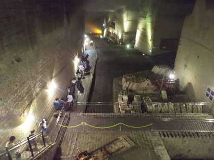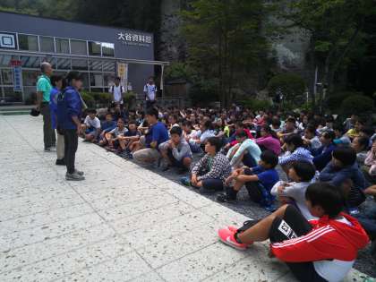 大谷資料館につきました。大谷石を切り出したあとの広ーい坑道の中は、気温12度。ガイドさんの説明を聞きながら、見学しました。