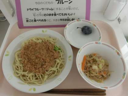 今日は秋の果物、プルーンをデザートに出しました。子どもたちにとっては、なじみの薄い果物で、「これ何?」という声を聞くことが多かったです。食べてみると「美味しい〜!」と喜んで食べている姿を見ることができました。