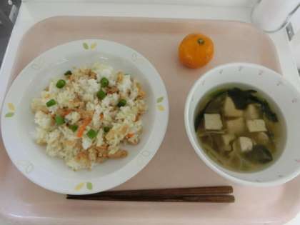 今日はこぎつねごはんです。鶏肉や野菜、油揚げを甘辛く煮て、ごはんに混ぜて作ります。彩りをよくするさやいんげんは味が苦手な子もいますが、1学期と比べて食べられる児童が増えてきたように思います。