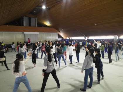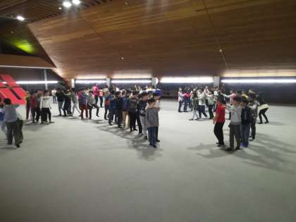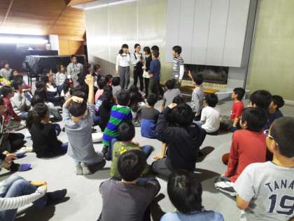 村の会堂で室内レクの時間です。各クラスのレク担当が、ゲームを紹介してみんなで楽しみました。