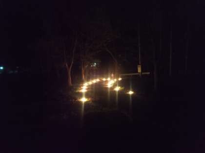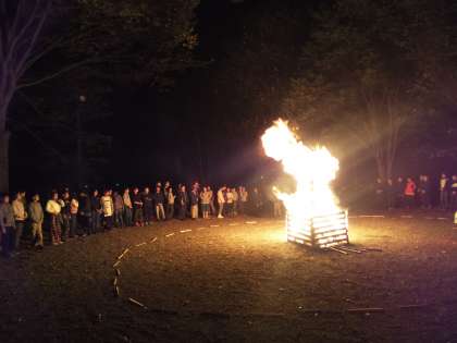 夕食後、キャンプフィヤーを行いました。友情の火、団結の火、努力の火をともしてきました。係の活躍でゲームと踊りで盛り上がりました。