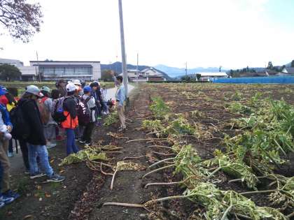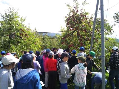 関リンゴ園で、りんごとジュースをいただきました。その後リンゴ栽培についてのお話を聞き、リンゴもぎをさせていただきました。蒟蒻畑を見ながらSLホテルにつき、お弁当を食べました。