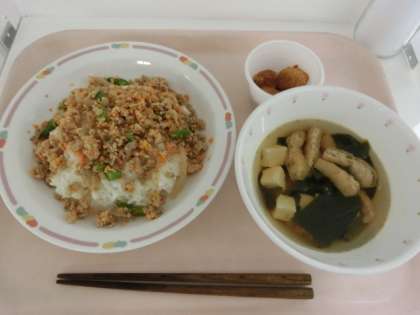 今日は八丈島産の「とびうお」のすり身を使ったそぼろごはんです。しょうがをきかせて魚のにおいをやわらげ、少し鶏肉を混ぜて食べやすくしています。そぼろという形状もあってか子どもたちはとてもよく食べ、中には食べ終わってから「えっ魚だったの!?」と言う子もいました。
