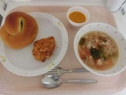 2学期の給食は今日が最後です。ほんのり緑色のあしたばパン、赤いミネストローネ、フライドチキンは、子どもたちが楽しみにしているクリスマスを意識した献立です。そして22日は冬至ということで、デザートはかぼちゃプリンにしました。