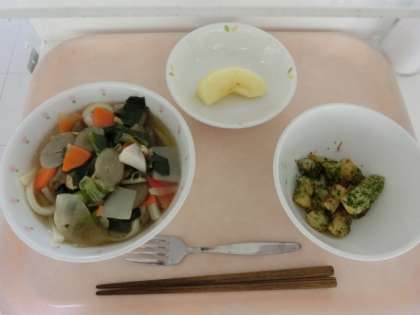 今日は野菜たっぷりのうどんです。ごぼうやだいこんのインパクトが強いのか、食べきる自信のもてない子もいたようでしたが、「今日は野菜をうどんのつゆに入れているから、食べられるだけ食べてみてね」と言うと、子どもたちは野菜のおいしさを感じながら食べていました。