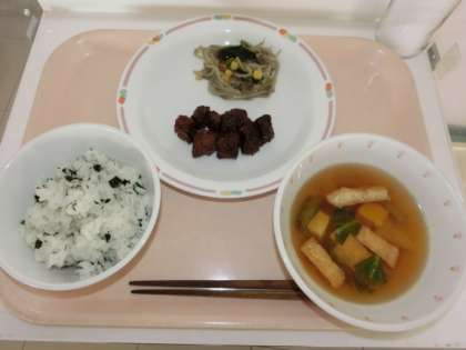 今日は給食週間に合わせて「くじら」です。去年は一切れが大きい竜田揚げでしたが、噛み切るのが大変そうでした。そこで今年は一口サイズにし、味付けも甘辛いタレに変えました。