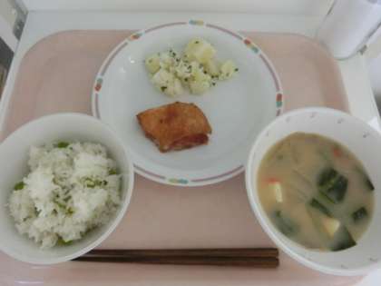 今日の主菜は鶏の照り焼きでした。学校で使用しているオーブンは、熱風と蒸気の両方で加熱できるので、短時間でしっかり火を通すことができます。ジューシーなお肉に味がよく染みていて、ご飯にぴったりのおかずになりました。