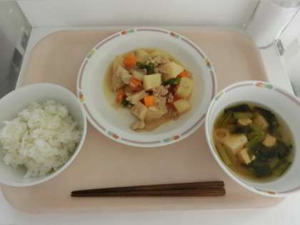 新年度の給食が始まりました。献立は、ごはんと小松菜の味噌汁、そしてじゃがいものそぼろ煮です。今日は冬に戻ったような寒さだったので、温かい煮物が特においしく感じました。子どもたちは「久々に給食が食べられて嬉しい!」と喜んで食べていました。