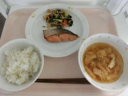 今日は魚のある和食献立です。配膳のときに「骨がやだなぁ」と言っている子がいました。給食の魚は骨が少ない切り身がほとんどなので、食べながら慣れていってくれたらいいなぁと思っていたのですが、いざ食事中の様子を見に行くとほとんどの子が鮭を食べきっていました。鮭は身近な魚なので、食べやすいのかもしれません。