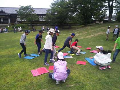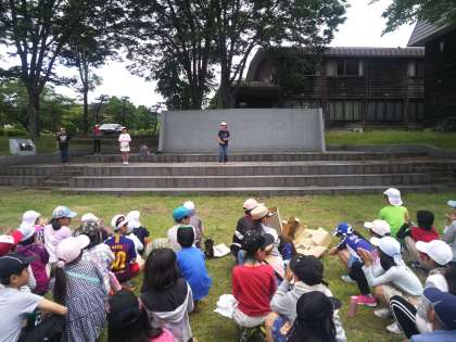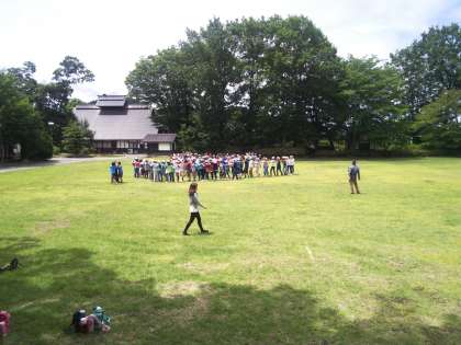 民俗資料館前の広場には、川場小の友達が待っていてくれました。始めの式のあと、全体での交流と班ごとの交流を行いました。予定より早くついたので、たっぷり遊ぶことができました。