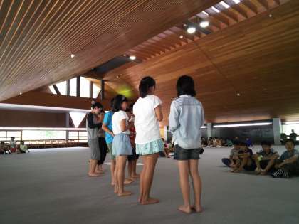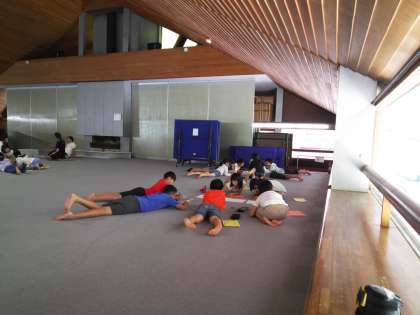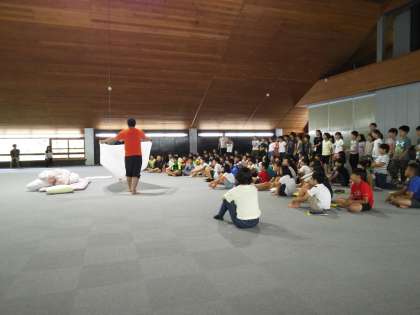 昼食後、村の会堂で体験報告会をしました。1日半をそれぞれに振り返って付箋にまとめ、班の中で共有しました。その後、代表の班が発表しました。最後に布団のたたみ方について学習しました。