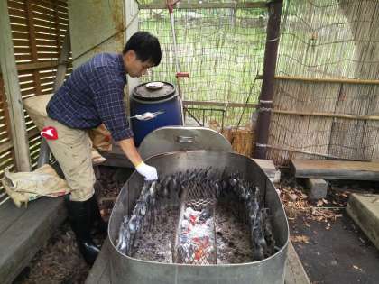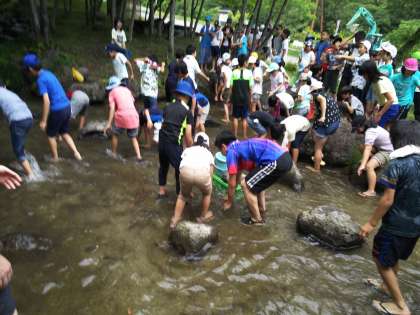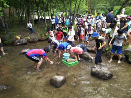 クラスごとにマスのつかみ取りに挑戦しました。マスはその場で串に刺して、炭火で焼きます。
