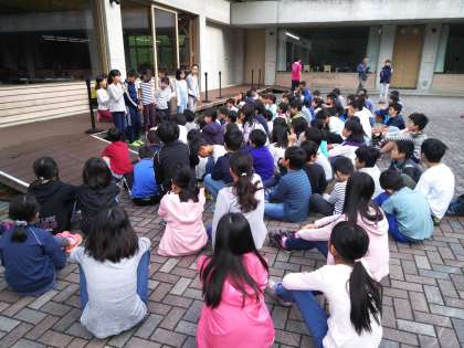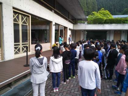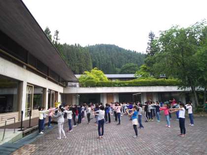 雲の切れ間から青空が見えます。みんな元気に3日目の朝を迎えました。昨日の反省と今日の目当てを確認し、体操をしました。今日は村めぐりです。その前に部屋の片付けが大事です!