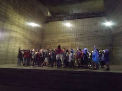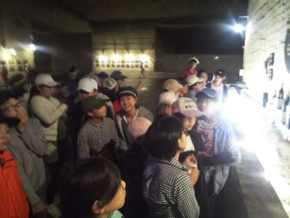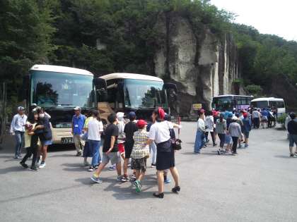 予定より早く大谷資料館に着きました。かつて石を切り出した坑道の中は冷蔵庫のようでした。ホールのようなところで、全員で「宝島」を合唱してみました。外にでると別世界。暑さがきびしいので昼食はバスの中で食べました。