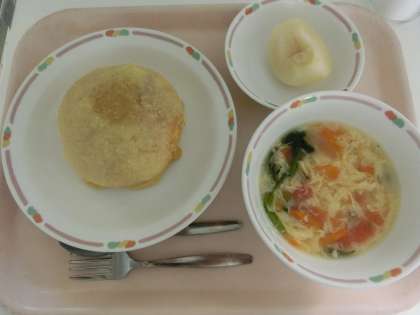今日は主食がパン、デザートが果物なので、スープにお肉や野菜をたくさん入れています。食味をよくするためにトマトは一つ一つ湯むきし、小松菜はあらかじめ下ゆでをして、仕上げ前にスープに加えることで、できるだけ色落ちさせないようにしています。卵もきちんと火を通しつつ柔らかくなるように、調理員さんたちが上手に仕上げてくださいました。