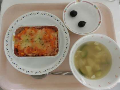 今日のドリアは、ケチャップライス、具入りのソース、チーズをそれぞれグラタン皿に乗せて焼いて作りました。子どもたちはとてもおいしそうに食べていました。珍しいメニューで、見た目もとても整っているためか、最初は手作りだとわからなかった児童もいたそうです。