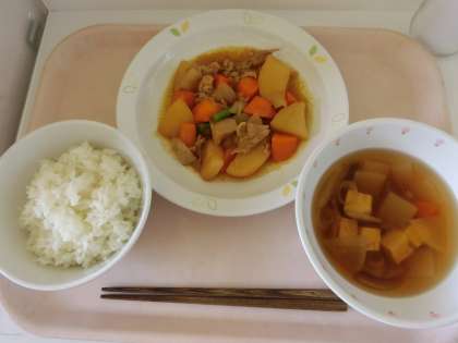 カレー肉じゃがは、いつもの肉じゃがの仕上げにカレー粉を加えて作ります。給食ワゴンが教室前に上がると、カレーのいい匂いが広がって、教室に帰ってきた子どもたちが「いい匂い!」「お腹減ったー」と嬉しそうに準備をしていました。