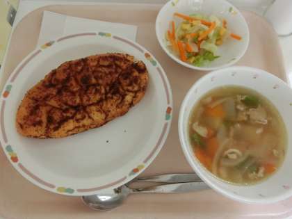 今日の揚げパンはココア味です。献立を確認して大喜びする児童がたくさんいました。スープやサラダが苦手でも、揚げパンのおかわりジャンケンのために完食する子もいて、さすが人気メニューだなと思いました。