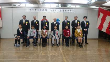 11月11日(月)梅ヶ丘パークホールで、表彰式がありました。これは、一般社団法人 北沢青色申告会が主催した「令和元年度 税を考える週間 小学生の書道展」の表彰式です。総作品数4,061点の中から千歳台小学校から5点選ばれました。