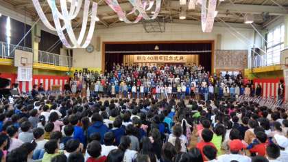 11月14日の音楽朝会は、40周年記念式典で5・6年生が歌う「ほほう!」の発表でした。200人以上の子どもたちがステージ上に整列すると迫力がありました。