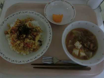 給食の親子丼はしっかり加熱されているので半熟ではありませんが、野菜やお肉のだしを吸っているのでやわらかく仕上がっています。