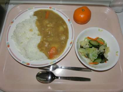 今日はみんなが大好きなカレーライス。作っている間から廊下にはカレーのいい香りがただよいました。「給食のカレーは甘すぎも辛すぎもしなくて、家で食べるカレーとはまた少し味が違っておいしい!」と言ってくれた子がいました。