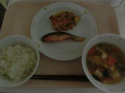今日の鮭は、塩麹に漬けてから焼いています。焼きたてはもちろん冷めても身がふっくらしていて、とてもおいしく仕上がりました。気づかず食べてしまったという子も多かったので、次回はもっと宣伝しようと思います。