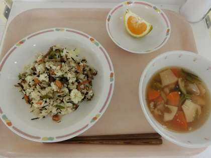 葛の産地から名前がついた吉野汁。実際にとろみづけに使ったのは片栗粉ですが、寒い日に食べるとほっとする味わいです。子どもたちも「温かい!」と嬉しそうでした。ごはんには揚げ大豆が入っていて、カリカリの食感と大豆の風味がおいしい混ぜご飯です。「まだ大豆ありますか!?」とおかわりに来た子もいました。