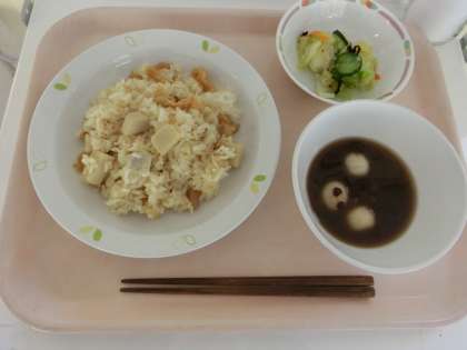 明日は鏡開きです。給食では鏡餅の代わりに白玉もちを使ったおしるこを出すとともに、鏡開きについて紹介するおたよりを配りました。おしるこは小豆をじっくり煮て、甘さを確認して砂糖の量を調整しながら作り、ほどよい甘さに仕上げています。小豆やあんこは子どもの好みが分かれるので、苦手な子も一口食べてみるように声をかけました。