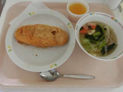 揚げパンの日は、「今日揚げパンでしょ?楽しみ!」「きなこをたくさん入れてほしい!」と声をかけられます。今日の献立は給食委員の人が提案してくれたもので、ゼリーはみかんのつぶ入りです。子どもたちはパンもスープもゼリーも、おいしそうに完食していました。