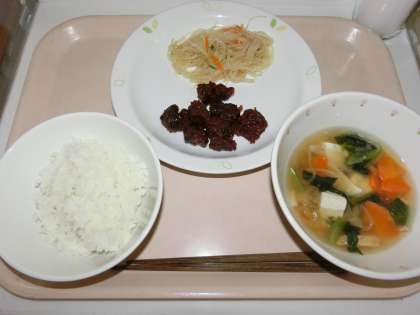 バンサンスーは細切りの野菜や春雨の中華風の和え物です。春雨と一緒に野菜もツルツルと食べられます。気に入ったらしい子が、山盛りにおかわりをしていました。
